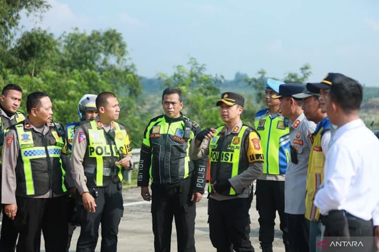 Kapolres Sukabumi AKBP Tony Prasetyo bersama jajaran saat memantau kesiapan jalur mudik lebaran di wilayah utara Kabupaten Sukabumi, Jabar yang merupakan penghubung antara wilayah Sukabumi dengan Bogor. (FOTO: ANTARA/Aditya Rohman)